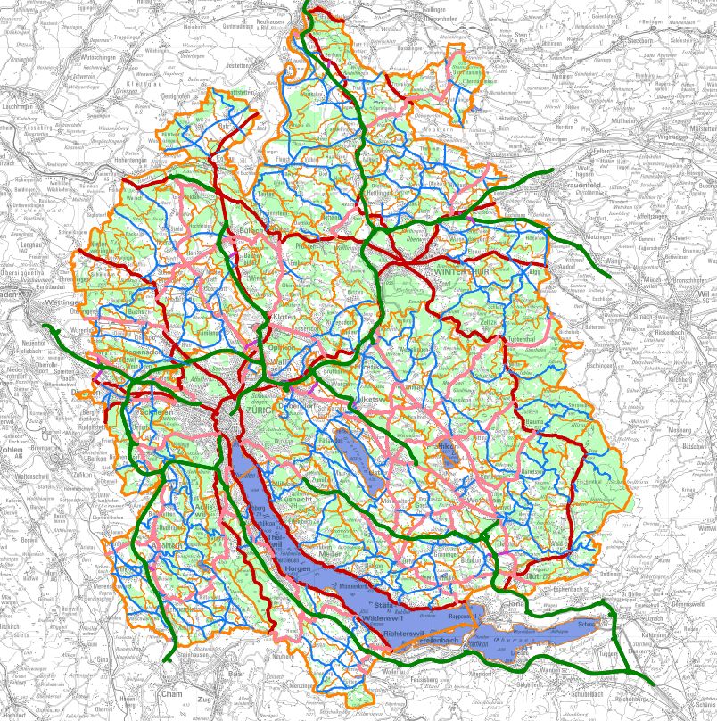 Das Strassennetz umfasst alle National- und Staatsstrassen sowie die für das Verkehrsmodell wesentlichen Gemeindestrassen des Kantons Zürich. Der Datensatz enthält auch die Verkehrslastklassen (Wert für die Dimensionierung des Strassenoberbaus).