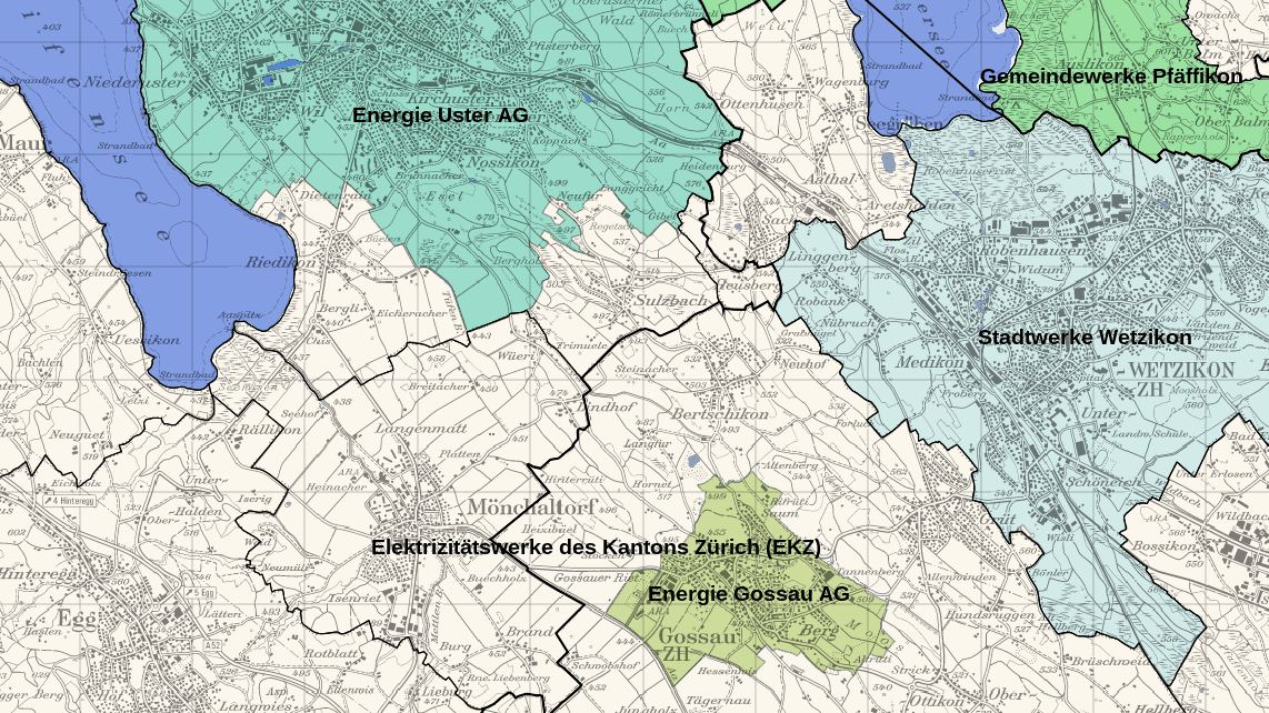 Stromnetzgebiete der Netzbetreiber im Kanton Zürich. Flächendeckende Zuteilung, wo möglich parzellenscharf.