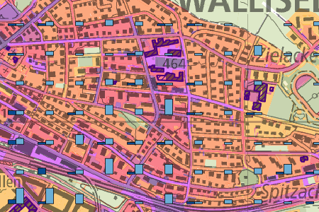 Das Fussverkehrspotenzial berechnet die geschätzte Anzahl Fusswege pro Gebäude und legt diese auf das Fusswegnetz um. Damit zeigen sich Abschnitte im Fusswegnetz, die für den Fussverkehr für den Alltagsverkehr von grosser Bedeutung sind.